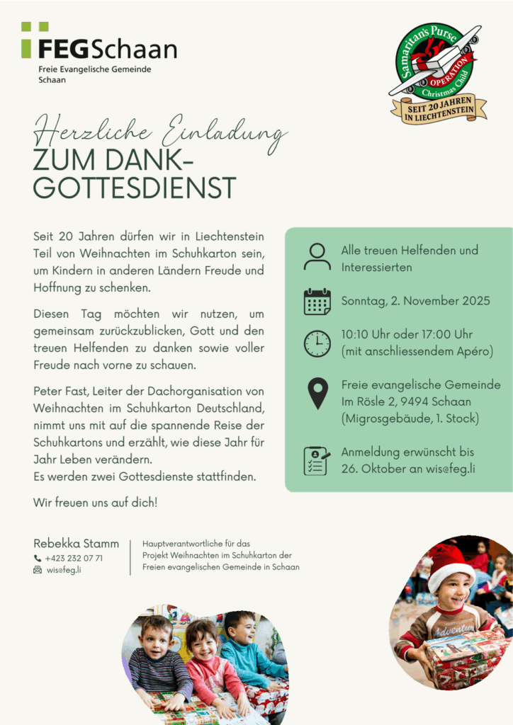 Die FEG Schaan ist eine staatsunabhängige evangelische Freikirche. Sie versteht sich als Teil der weltweiten Gemeinde von Jesus Christus und ist Mitglied des Bundes Freier Evangelischer Gemeinden in der Schweiz. Zur FEG Schaan gehören Menschen, die an Jesus Christus glauben und durch ihn Frieden mit Gott und ein neues, ewiges Leben geschenkt bekommen haben.
