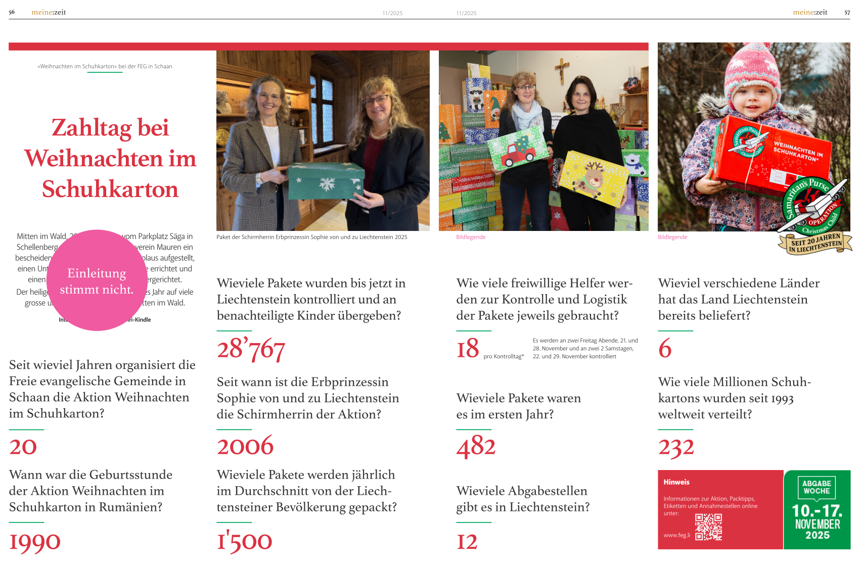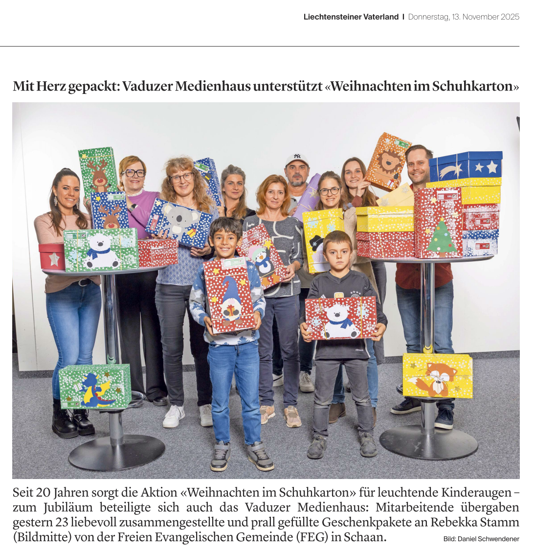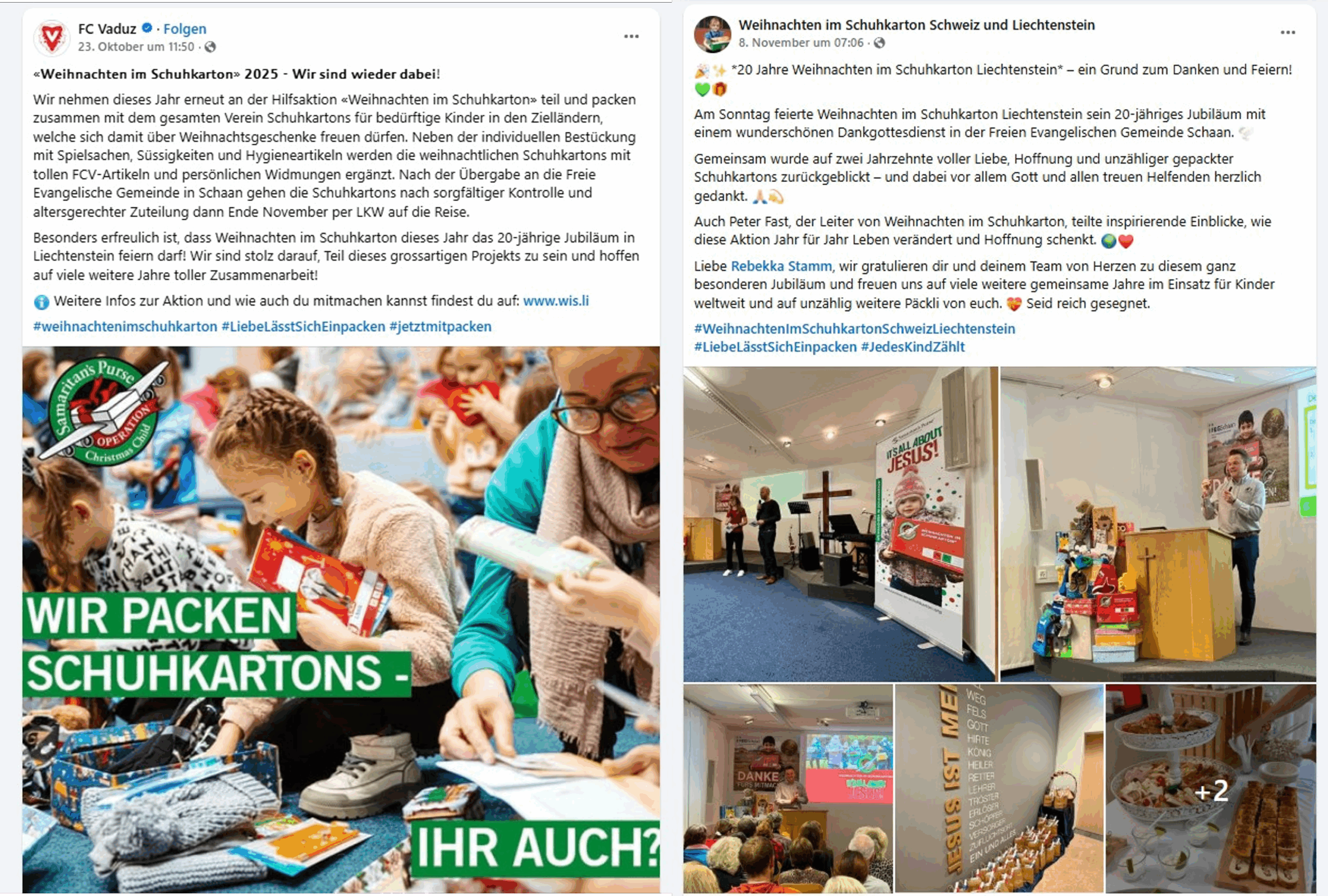 Bei „Weihnachten im Schuhkarton“, einer Geschenkaktion der christlichen Hilfsorganisation Samaritan’s Purse, kann jeder mitmachen und einem bedürftigen Kind damit Wertschätzung und Freude entgegen bringen – ganz nach dem Motto Liebe lässt sich einpacken. Die FEG Schaan ist Organisator in Liechtenstein und seit 2006 sind über 28’000 Pakete aus Liechtenstein zu bedürftigen Kindern gelangt.